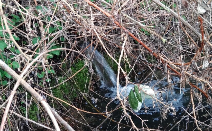 Our immediate concern was that it could be a leak from the Sewage works’ tanks, so we tested the “gusher” for E.coli. This showed that it had an E.coli of 4,500 /100ml. Although this is unhealthy, it was much less contaminated than the treated effluent from STW which had 29,000 E.coli/100ml. For comparison, Bathing water will be classified as “Poor” if the E.coli is occassionally > 900/100ml