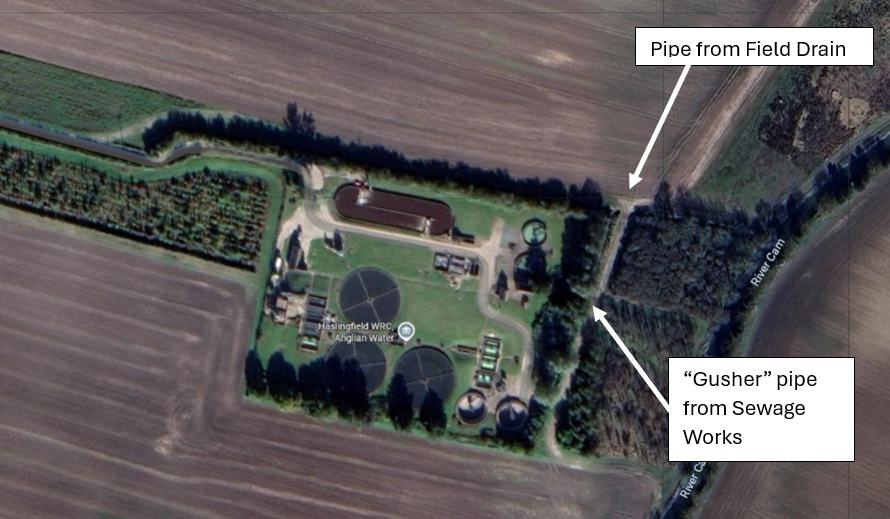 In February 2026, we were concerned to see a mysterious 4” hole gushing water under the eastern boundary fence from Haslingfield Sewage Works. This flowed into a ditch, then into the Rhee.