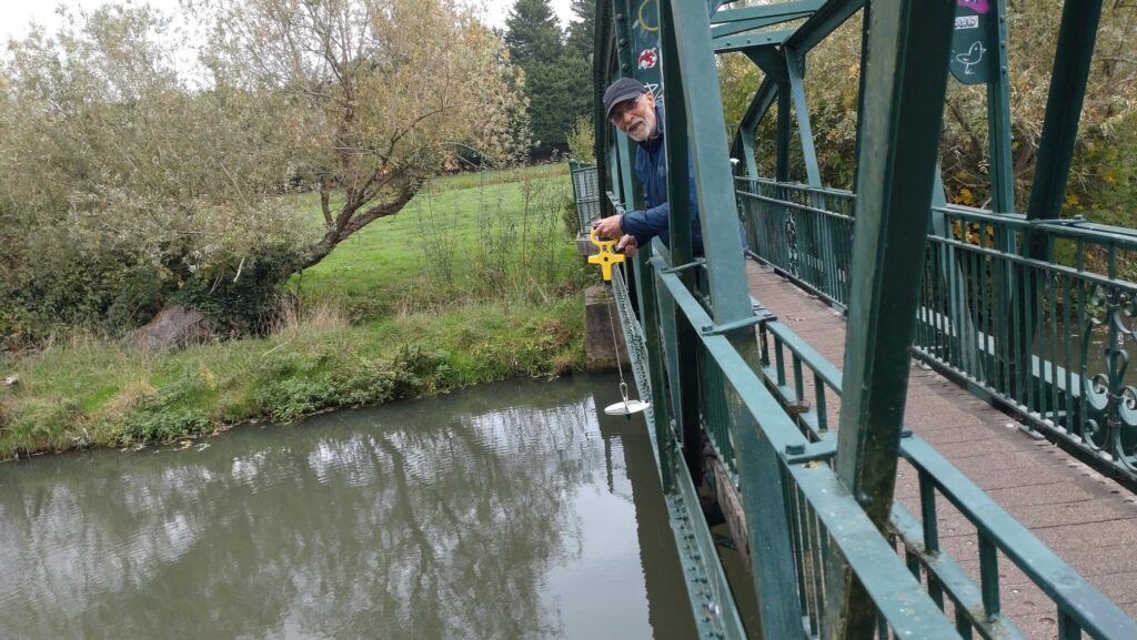 As the Cam is quite deep here, we do this using a “Secchi disk”, measuring the depth at which the black and white segments are no long distinguishable. This is called the “Depth to Invisiblity” or DTI.